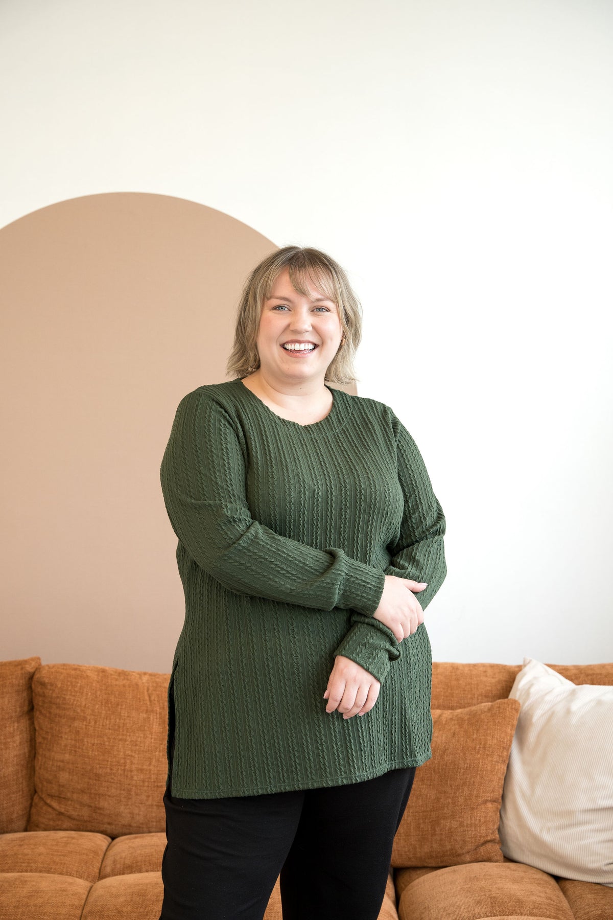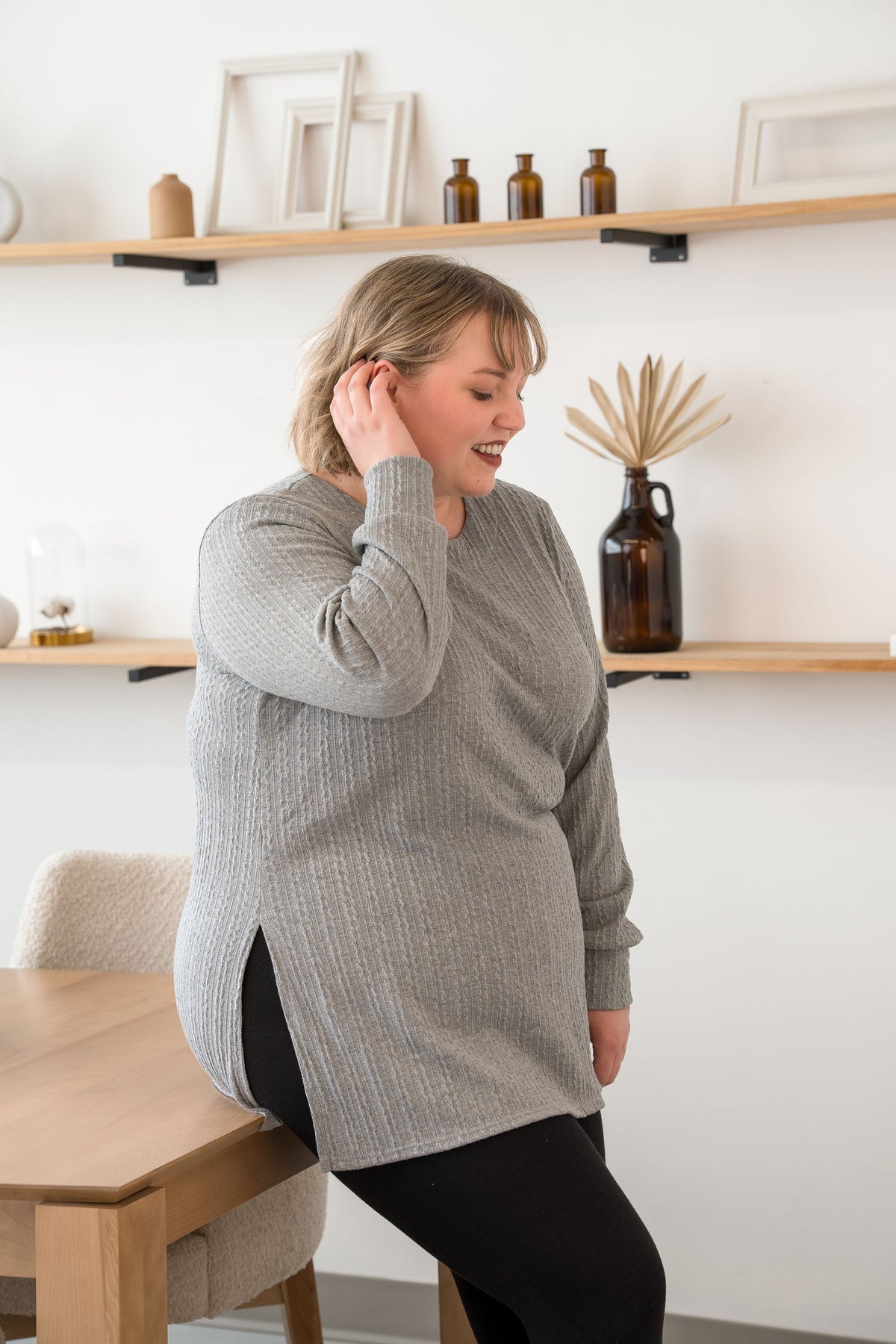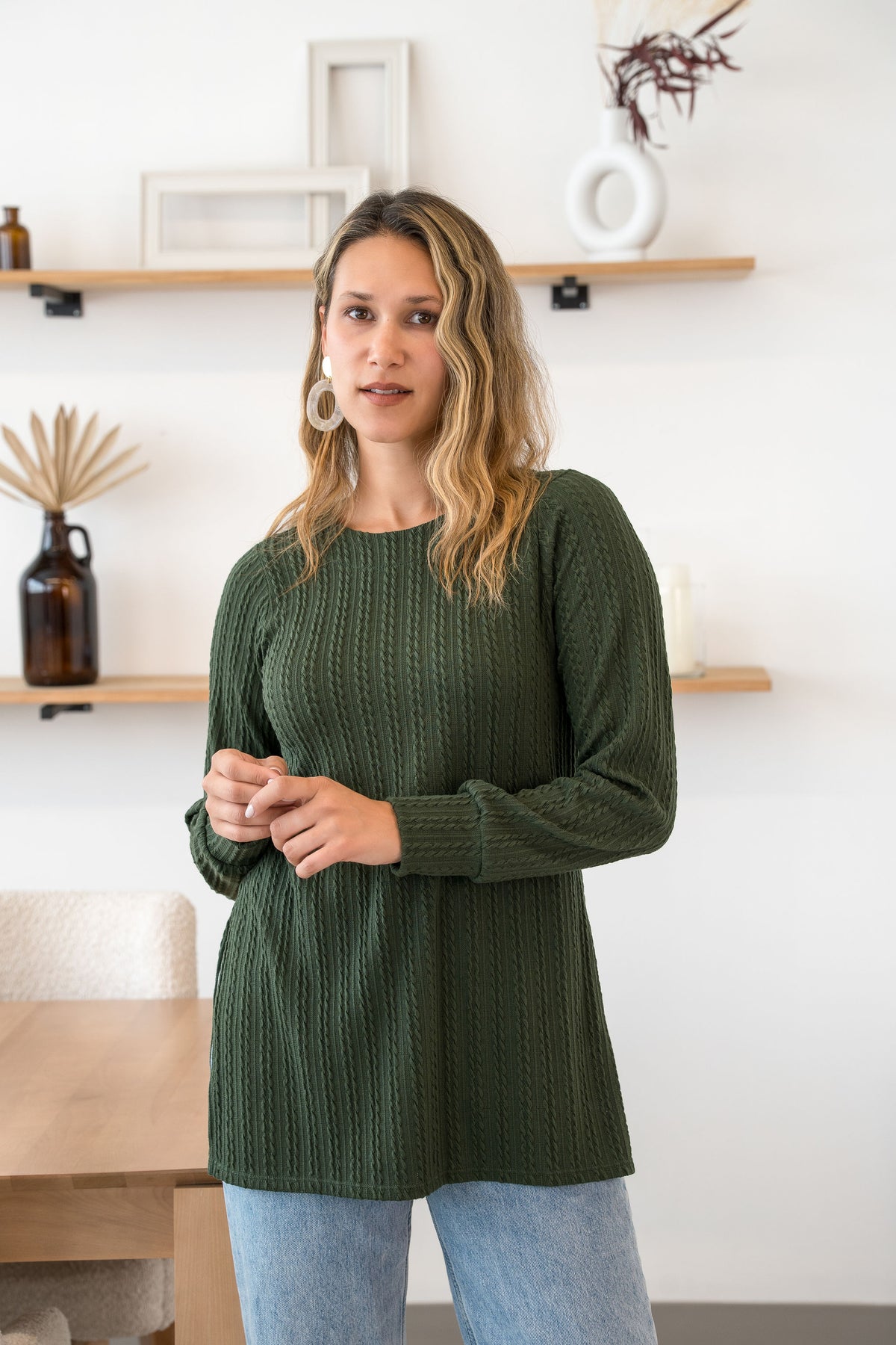Un chandail long et droit, qui tombe naturellement grâce à ses fentes de chaque côté. Son tissu extensible présente un léger relief façon câble et offre une douceur réconfortante, idéale au quotidien.