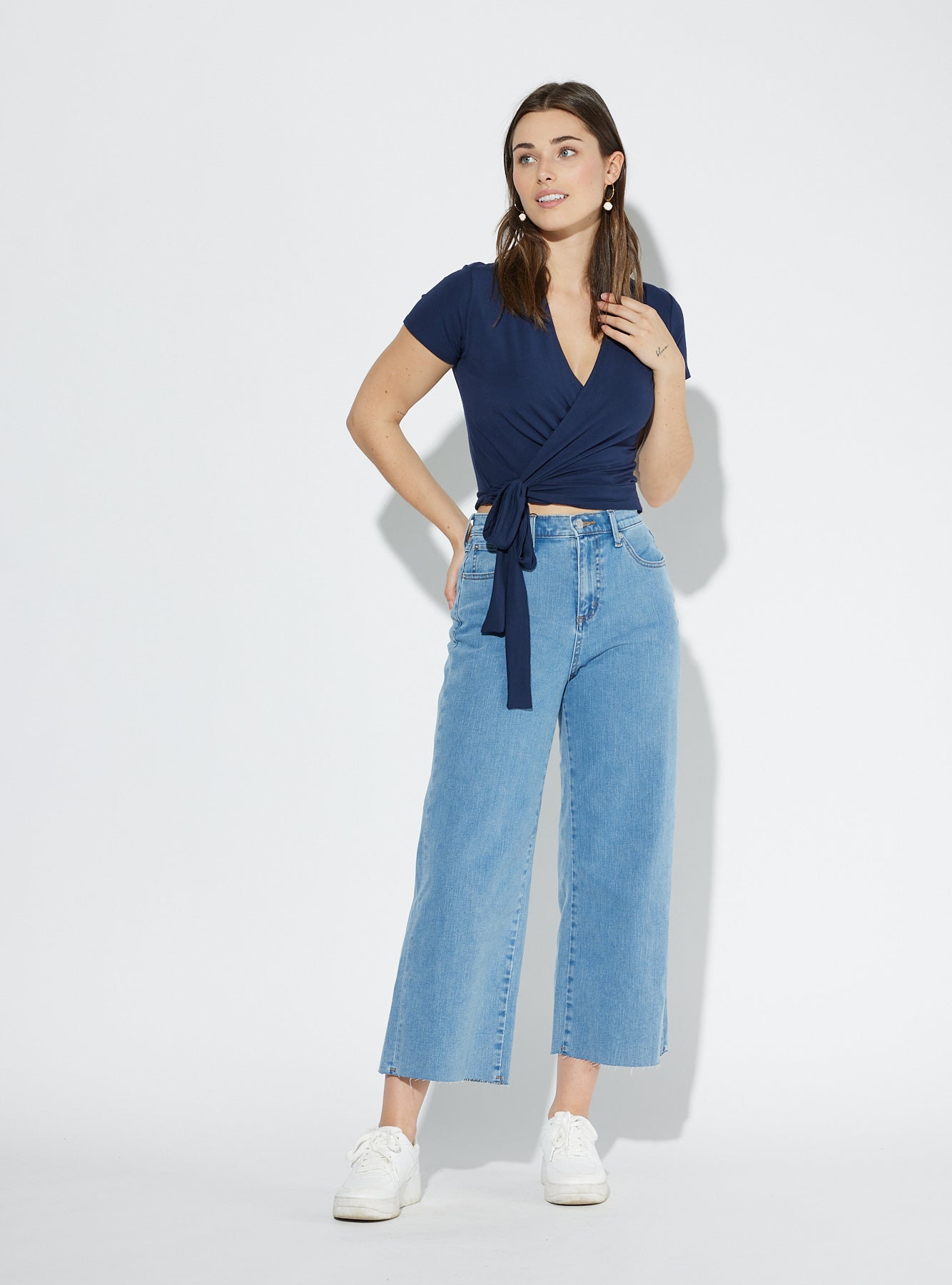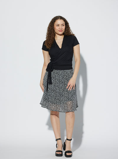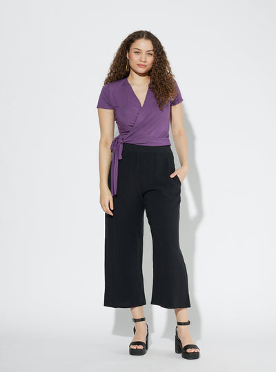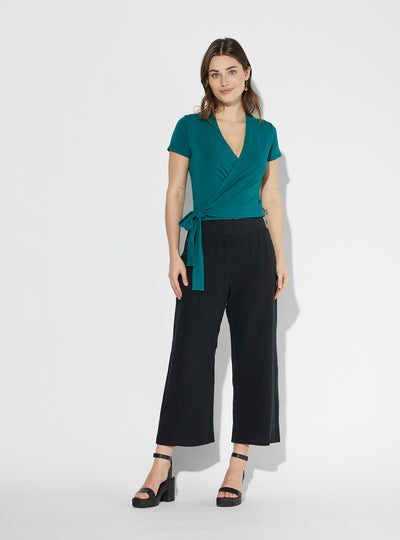 The Hortensia top is a fitted and cropped 'faux' wrap top that will allow you to multiply the options of ensembles in your wardrobe. We talk about a 'fake' wrap top because the bottom part is complete and sewn. So we put it on like a sweater and we close the top part afterwards. It also goes well with a skirt, pants, jeans or shorts. It can be worn with almost all the bottoms in the collection. It ties at the side and is made from our certified bamboo rayon.