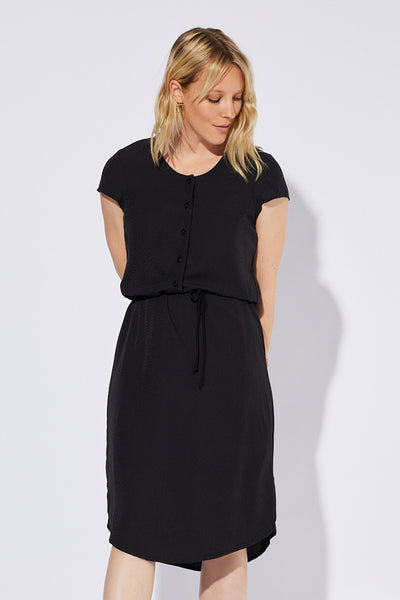 Short-sleeved dress with buttons in the center and a removable belt at the waist.