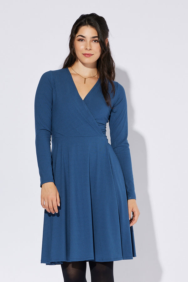 Bamboo rib wrap-over dress with a full skirt and long sleeves.